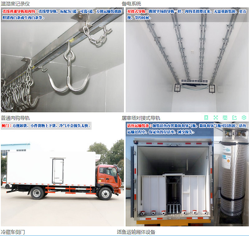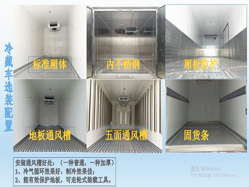 選裝配置:導軌肉鉤、T型通風槽、右側開側門、溫度實時監控帶打印裝置、裝海鮮廂體內部面料必須選裝不銹鋼制造、可選裝12V-24V外接電源(車輛在停止時,廂體通過外接電源進行制冷)。